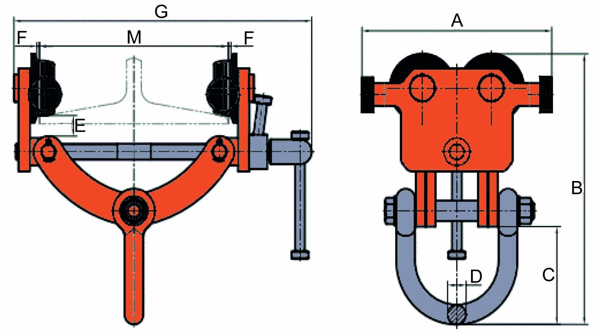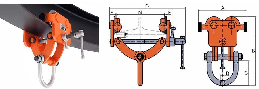 The adjustable trolley is fitted with wheel guard anti-drop plates and precision ball bearing wheels allowing easy movement along the beam. It adapts to the beam width by turning the adjustable bar and is fitted with a locking mechanism for ensuring secure clamping to the beam.